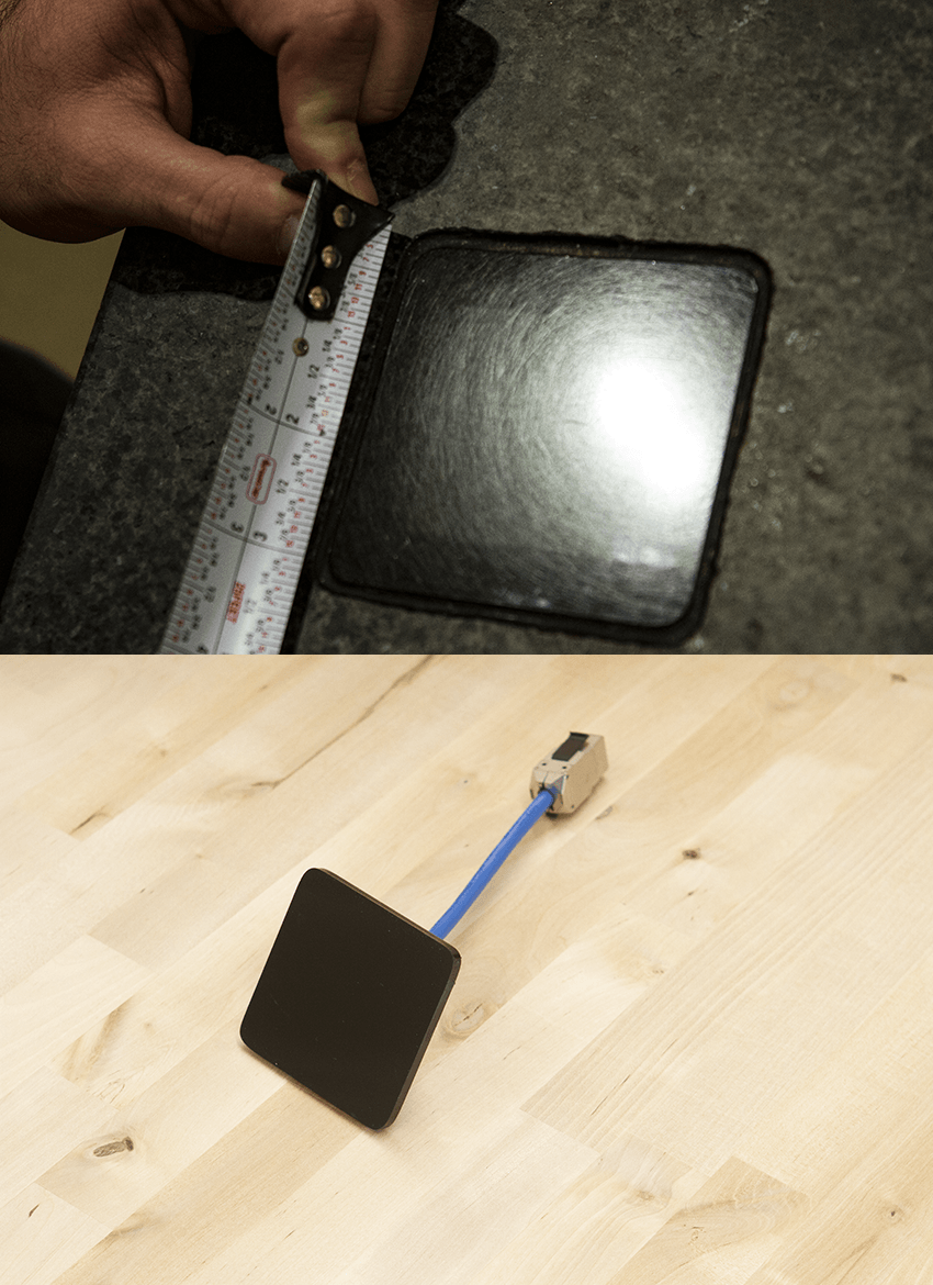 Architects love the ability to design and integrate custom read heads into entry designs. FirstPrincipals is the solution for compatible esthetic readers. The top of the image is our field survey for a reader window in a turnstile. The client needed standard proximity, iClass, and mobile access. Usually, a multiclass reader addresses this requirement. In this installation, the metal substructure and the granite thickness precluded this solution.